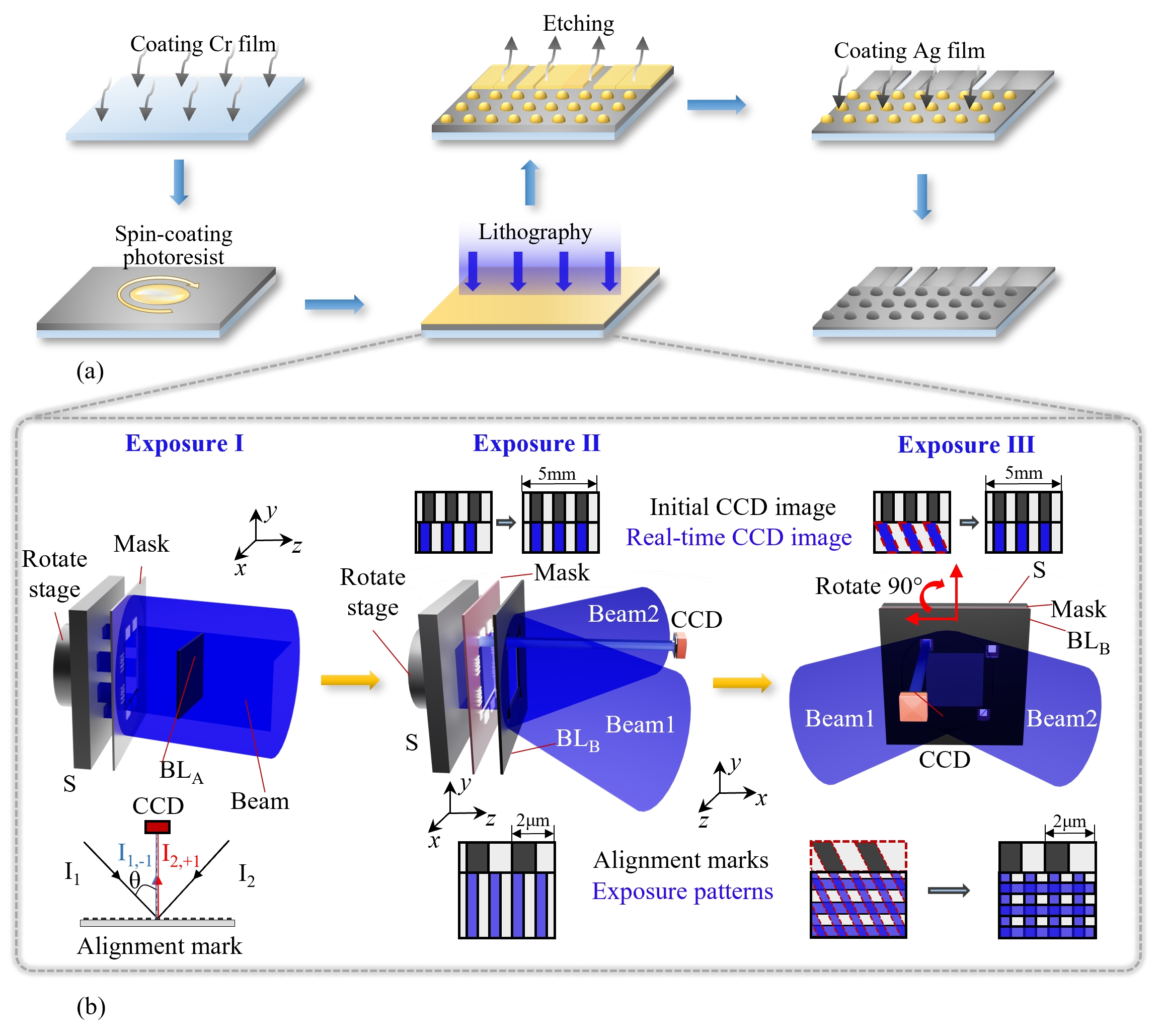 为应对混合光栅在结构尺度上跨越纳米级(~500nm)至毫米级(~1.5mm)线宽的加工需求,研究团队提出并实现了一种的混合光刻策略。该策略以掩模光刻和干涉光刻为核心,通过多步曝光流程,在同一基底上构建周期性纳米结构与非周期性微米图案,实现了跨三个数量级尺度结构的高精度共层制造。